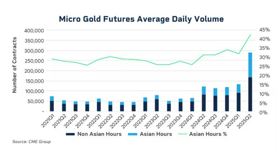 • Расширение деривативной торговли в Азии. Этот недавний, но важный тренд усилил ликвидность и «моментум-качества» золота. Например, ликвидность фьючерсов на золото COMEX (GC) в азиатские часы росла вместе с ценой: исторически на этот период приходилось около 25% дневного оборота, а во II кв. 2025 г. доля превысила треть. Рост ликвидности ещё заметнее в микро-фьючерсах на золото (MGC): во II кв. 2025 г. на азиатские часы пришлось ~42% глобального оборота MGC — на 16 п.п. больше, чем два года назад: