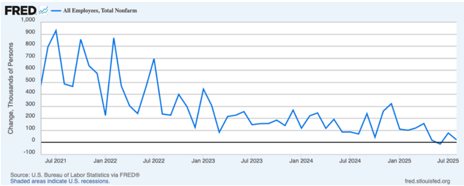 Ослабление рынка труда США (замедление прироста занятости NFP во II–III кв. 2025 г. до уровня ниже «нейтрального», оцениваемого примерно в 50 тыс., рост обращений за пособиями по безработице, динамика вакансий JOLTS) и признаки успокаивающейся инфляции подтолкнули ФРС к началу цикла снижения ставок: