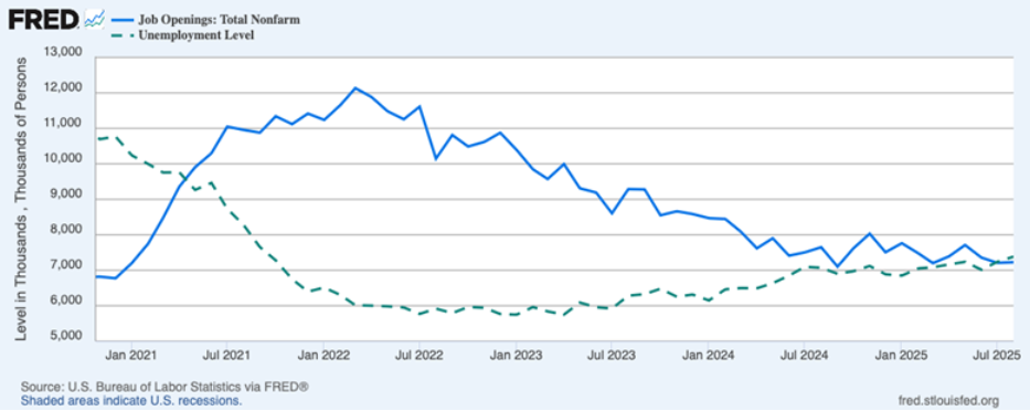 Число открытых вакансий vs. число безработных. Источник: FRED