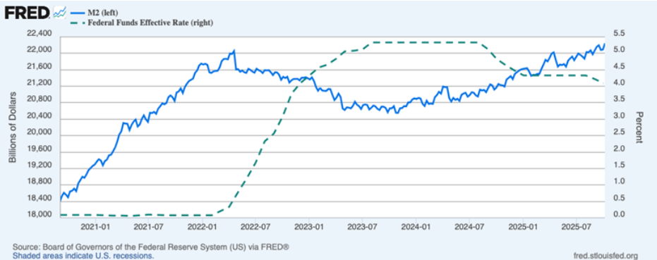 Объем денежной массы и ставка по федеральным фондам ФРС. Источник: Fred