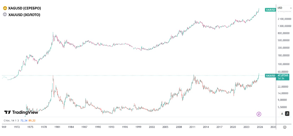 Золото, за исключением последних двух недель, активно ставило исторические рекорды, в последний раз достигнув отметки в 4381 доллара за тройскую унцию. Сейчас на рынке наблюдается коррекция, что неудивительно после такого экспоненциального движения. Но как долго она продлится и откуда может начаться новый потенциальный рост? Для ответа на этот вопрос стоит вспомнить, что в связке с жёлтым благородным металлом также торгуется и серебро, проявляя сильную положительную корреляцию.